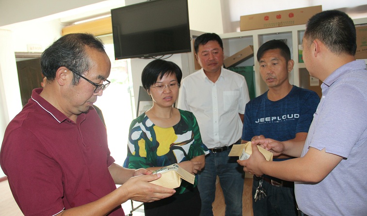 图为当阳市政协主席孙照玉(左一) 在两河电商服务站察看本地特产鱼腥草茶