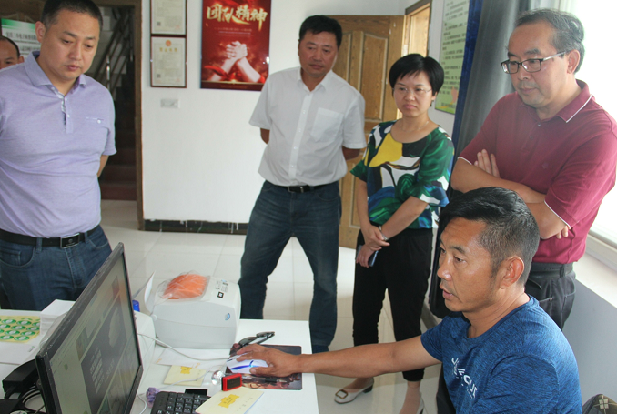 图为当阳市政协主席孙照玉(右二) 在两河电商服务站察看电商户线上操作