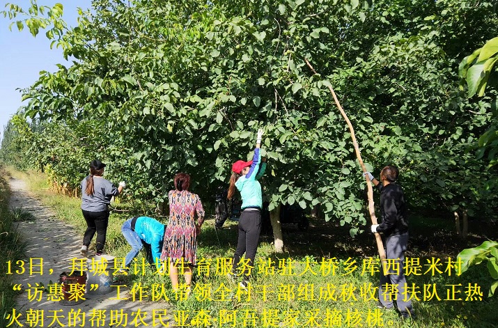 清风网讯(祝乐乐)又是一年丰收季,天气虽然已经入秋,但暑气未散,下午一两点正是一天之中最热的时候。9月13日,拜城县计划生育服务站驻大桥乡库西提米村“访惠聚”工作队带领全村干部组成秋收帮扶队正热火朝天的帮助农民亚森·阿吾提家采摘核桃。
