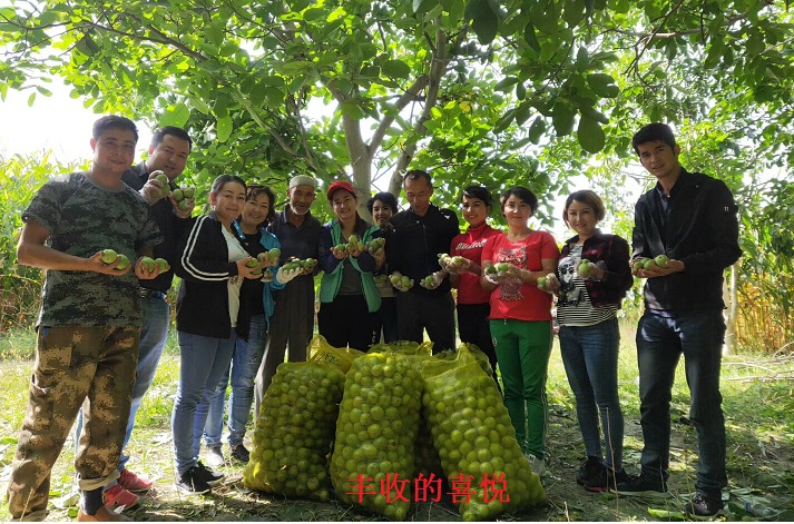地里灰尘四溢、蚊虫肆虐,但仍然没有降低大家干活的热情和喜悦,队员们分工合作,有的拿长杆敲打高处核桃,有的提着水桶和麻袋捡掉落在地上的核桃,更有甚者爬上树去采摘长在树上的顽固核桃。所有人都非常仔细认真,这一颗颗的核桃可都是农民的心血和汗水的结晶呀。大家越干越起劲,截至下午17点,连续2天的劳动终于将所有核桃采摘完成了。今年亚森·阿吾提家的核桃长得实在喜人,获得了大丰收。
