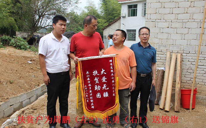清风网讯( 通讯员 童曙明 王思淼) 9月13日,湖北英山县方家咀乡熊家冲村10组贫困户郭庆锋、专门为前来帮扶的省高院驻英山扶贫工作队队长、英山县副县长周鹏和英山法院院长汪峰、政治处主任沈勇送上一面“扶贫助困、大爱无疆”的锦旗和感谢信,感谢省县法院扶贫干部的帮助。这是省县真情系帮扶贫困户的一个缩影。