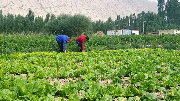 拜城县铁热克镇苏杭村是一个半牧半农的村庄,常住人口只有32户。今年年初,工作队来到村里以后,发现村民没有种植蔬菜的习惯,平时吃菜比较困难,菜贩子一周才来一次,而且还是去过附近的煤矿以后才到苏杭村,百姓们一年四季都很难吃上新鲜的蔬菜,于是工作队出资五千余元,购买种子、羊粪、薄膜等,整合八亩土地,并将整合好的土地分给村里的32户居民,用于种植蔬菜。