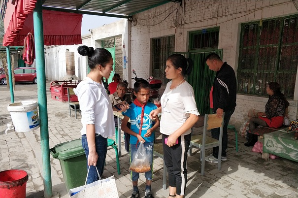 9月16日,沙雅县财政局驻沙雅镇其乃巴格村“访惠聚”工作队在走访入户中,发现一小学生躲在油桶后面哭泣,上前询问情况,得知小学生名叫安尼外尔·艾则孜,家住沙雅县红旗镇多勒昆村,以前在红旗镇上学,今年9月份转学到沙雅县第四小学六年级,目前寄住在姑姑吾古兰木·米吉提家。因不知道姑姑家已搬迁到其他社区,放假回来一直未找到姑姑家,情急之下又迷了路,一个人又饿又怕便躲了起来。工作队经多方打听后,终于联系上其姑姑吾古兰木·米吉提,并带他去饭店吃饭,然后将其安全送到姑姑家,其吾古兰木·米吉提连忙搂住自己的侄子,含泪握着工作队队员的手,说道“热合麦特,热合麦特。”