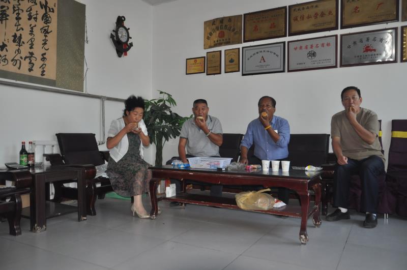 随后总经理范金兰女士还向我们介绍了公司的发展史:武威凉都食品有限公司是一家生产熏醋、酱油等酿造调味品及豆瓣酱、豆瓣辣酱、糕点、月饼的食品加工企业。公司成立于1998年,地处凉州区金羊镇平苑经济开发区,是集生产销售为一体的综合现代化食品企业。公司拥有享誉省内外的“凉都”“味味晓”两大自主品牌,武威市非物质文化遗产传承人、著名酿造大师郭旭光先生亲自坐阵监造。公司占地面积8000多平方米,现有员工40多人,其中酿造技师8人,拥有固定资产400多万元。食醋年生产能力5000多吨。良好的品质、可信的质量使产品多年来畅销本地与周边地区,辐射全国,深受广大消费者喜爱。公司被当地质量技术监督部门授予“质量信得过单位”和“产品质量监督检查连续三年合格企业“,并获得”中国消费者放心购物质量可信产品”等荣誉称号。