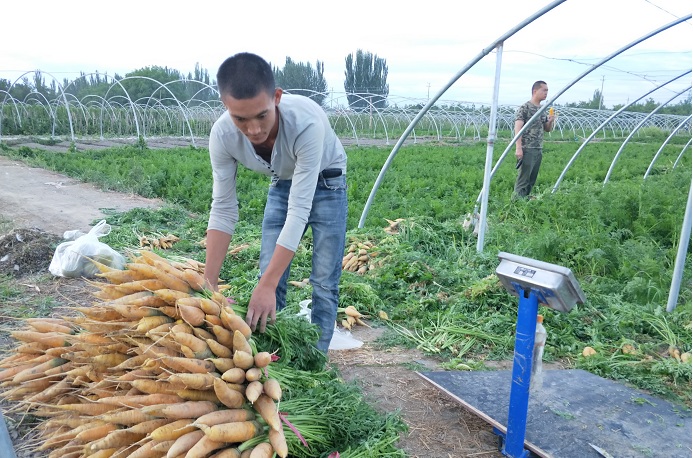大棚基地辣子、西红柿、茄子、豇豆、胡萝卜等20余种果蔬长势喜人,硕果累累,香甜诱人。据阿里木·赛买提介绍,今年仅一棚4分地的胡萝卜,创造经济效益7600元。