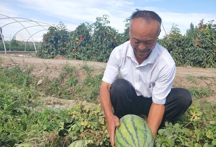 贫困户奥斯曼·买合木感激的说:“今年我种的西瓜上市早,价格10元/公斤,赚了6800元钱,今年第一轮种植就是大丰收,感谢工作队让我摘下了贫困的帽子”。