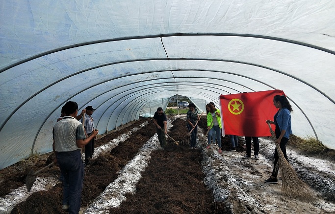 克其克古勒巴格村工作队,为节约开支,在完成发酵肥料、购买菌种等前期工作后,组织工作队员、村干部、团员志愿服务队20余人,开展蘑菇打埂、铺肥料、种菌种、盖棚膜等工作,干劲十足、充满自信,发挥好“排头兵”“领头羊”作用,为蘑菇种植工作开好局、起好步。