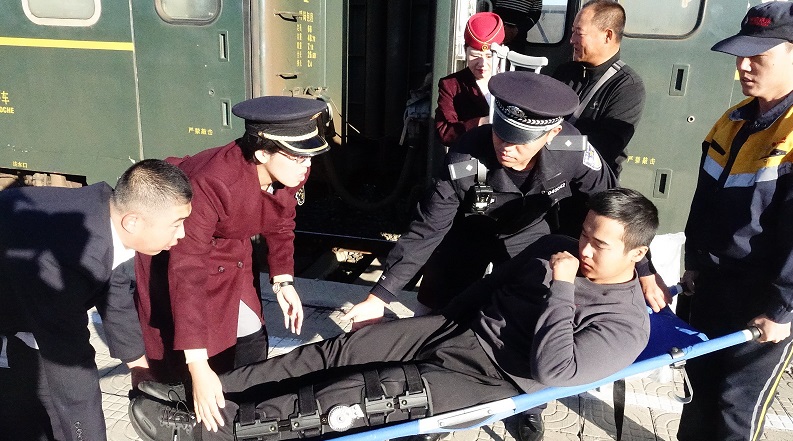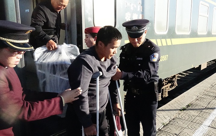 民警立即上前进行询问,据恩克都布信称,他因腿腿部韧带拉伤且腿部打有石膏行走困难,且其所乘K2011次旅客列车停靠白音华南站低站台,其主拐杖无法下车正常出站,执勤民警随即联系车站工作人员拿来担架,合力将其送至出站口并帮其联系家人,该旅客对白音华南所民警的热心行为予以由衷感谢,周围旅客也对民警全心全意为人民服务的精神给予了高度赞扬。