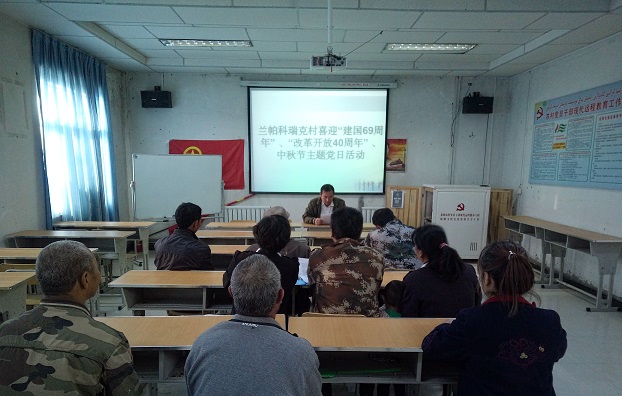 清风网讯 (沙雅县税务局 阿依吐然木·尼亚孜 )为激励广大党员、村干部团结拼搏,开拓进取,敬业奉献,2018年09月17日,沙雅县兰帕科瑞克村党支部,组织党员、村干部及入党积极分子13人来到兰帕科瑞克村委会开展兰帕科瑞克村喜迎“建国69周年”、“改革开放40周年”、中秋节主题党日活动,回顾历史,缅怀革命先烈,学习兵团精神,接受革命传统教育。此活动开展共六项议程。