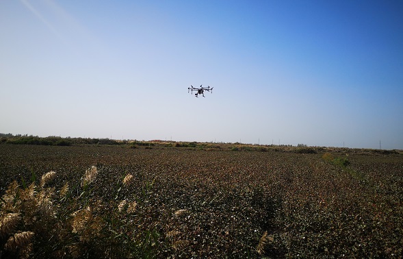 随着无人机缓缓起飞,农药在棉花植株3米上空均匀喷洒,利用飞机螺旋桨产生的气流覆盖到整株棉花上。