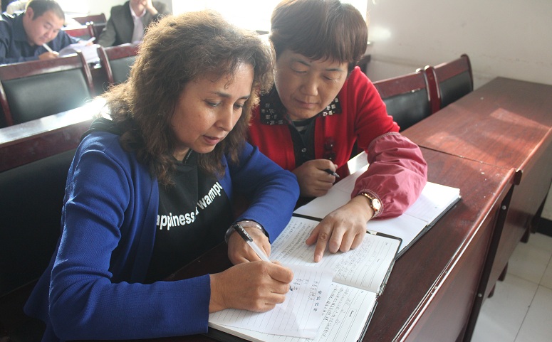 为了更好的做好群众工作,阿热孜古丽急需提高自己的国语水平,但她年龄已过50岁,学习国语有点困难。这也是压在阿热孜古丽心头的一块石头。吴新梅就利用每天晨会记录和各种会议记录、给居民打电话、与居民交流等等机会一点一滴的教阿热孜古丽学习国语,阿热孜古丽也时不时的教吴新梅维语,渐渐地工作了9个月时间的她们,阿热孜古丽可以用一些简单的国语和吴新梅交流,吴新梅也时不时的能用维语与阿热孜古丽沟通了。每到传统佳节到来的时候,她们都会互相问候,会彼此把民汉节假日的内涵和习俗讲给对方听,彼此了解民汉民族间的生活习俗。