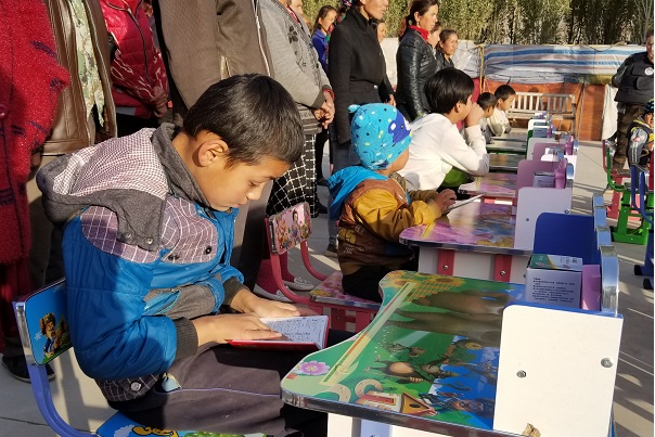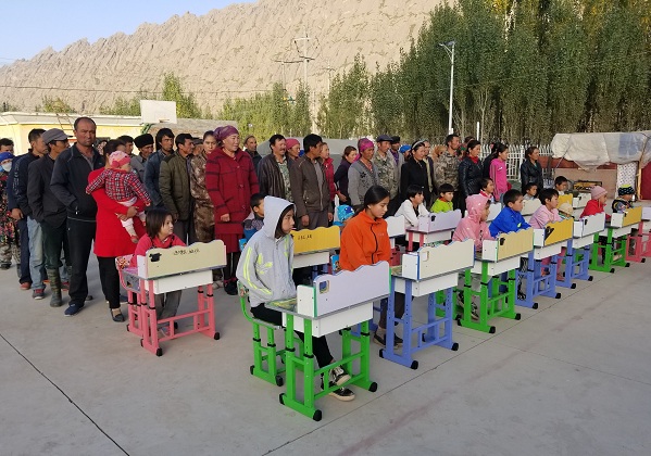 “叔叔,这个书桌我可以带回家吗?” “当然可以,这些就是送给你们的。”10月5日,在拜城县铁热克真苏杭村,一张张漂亮的书桌摆放的整整齐齐,上面还有字典、文具、台灯、闹钟等文具。