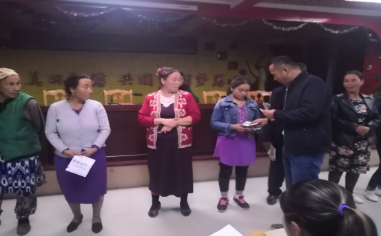 首先通过入户走访,掌握了辖区百姓的劳动能力、国语水平,分快、中、慢三个班对全村村民进行国语培训,强化村民国语沟通能力,为务工打下坚定的基础,并将村民组织起来,组织年轻力壮的人搬运葡萄,一天可以赚200元左右;组织妇女和老人去检打瓜或者剪葡萄,一天也可以赚100元左右。为鼓励更多的百姓务工,工作队联系种植大户的老板在村民大会上为百姓现场发钱,刺激更多村民通过务工走上致富的道路。