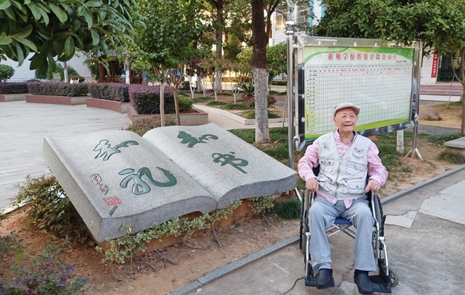 在学校负责人的引导下,期颐之年的周老先生首先来到他题写的校训“知书知礼”文化石旁,满心欢喜地与众人合影。随后,周教授饶有兴致地对整个校园环境进行了察看,对学校的校园布局连连称好。当看到有自己题写“新城学校”制作的笔记本时,连声道谢。