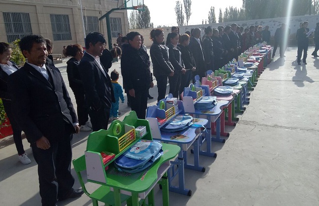 近日,拜城县人大驻察尔齐镇“访惠聚”工作队从教育入手、从娃娃抓起,联合派出单位,为该村小学一年级学生赠送了 套小课桌、小板凳、小文具、小字典、小台灯,通过一张张小课桌,为学生搭建起梦想的阶梯。