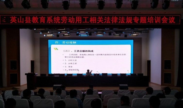 本次培训邀请了黄冈市人社局资深专家前来授课。讲师以《劳动法》、《劳动合同法》、《社会保险法》为主线,内容涉及劳动关系、劳动合同、工资与工时制度、社会保险、《英山县机关事业单位编外聘用人员管理办法》等五大方面。结合我县教育系统劳动用工实际情况,详细讲解了用工单位与劳动者订立劳动合同、解除劳动关系时注意事项、劳动合同的基本条款、工资与工时制度、社会保险费的缴存等相关内容。培训结束后,现场对参训人员进行了劳动用工法律测试,讲师对试题进行了讲解。整个培训过程中,所有参训人员注意力高度集中,认真听课,积极回答问题,会后积极主动与讲师互动交流,学习氛围深厚,收到了预期效果。