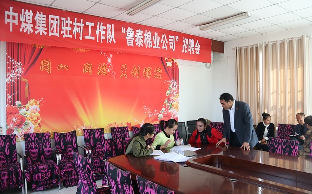 10月10日上午十点,中煤集团驻村工作队“鲁泰棉业公司”招聘会如期举行。此次共有46名村民报名参加了招聘,经过面试21名村民被录取。这已是中煤驻村工作队在九大队举办的第四次招聘会,截止今日已先后输送了100多名村民去鲁泰棉业公司就业,就业村民可获得平均每月3600元的稳定收入,让村民脱贫增收。新疆阿克苏日报记者董成忠还专程到村采访。