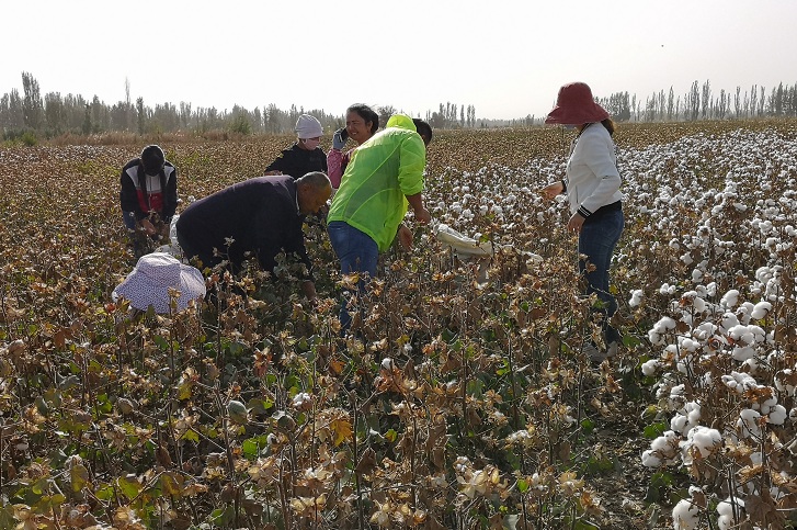 正值秋天拾花季,由于秋尽尾声,气温渐凉,部分困难户拾花劳力严重不足。中国邮政集团公司阿克苏地区分公司的下沉干部与工作队力量,深入到红旗镇克孜勒萨村的棉田里,总能看到三五成群的下沉干部系着棉花包,低着头,弯着腰,一双双手麻利地穿梭在棉株间,迅速将摘下的棉花装进棉包里,为困难户义务拾棉花。
