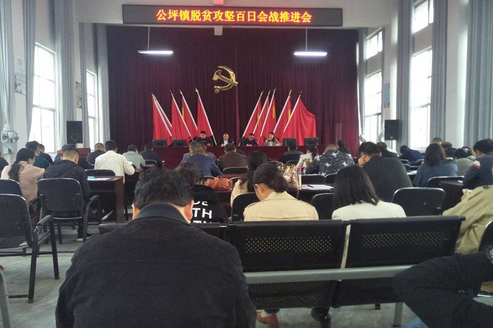 会议由公坪镇政府镇长丁芷安主持。会议首先由公坪镇分管扶贫工作的镇人大主席郑蕾对于会人员进行了培训,对后期的工作进行了安排部署;接着,镇党委书记曹晓宁进行了强调,要求所有帮扶干部全力以赴扎扎实实地做扶贫迎检工作,查漏补缺,按上级的要求做好各自的帮扶工作,不能出现任何问题,确保市检、省检、国检顺利验收过关。最后,县委办副主任舒振勇作了讲话,对如何搞好脱贫攻坚百日会战发表了自己的看法和建议。