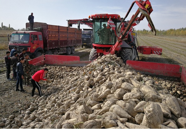 农民阿里甫家今年种植了十五亩的甜菜,为了帮助他家及时收获甜菜,拜城县水利局驻村工作队积极联系甜菜机,不到一会的功夫,十五亩的甜菜就收获完成。这样的景象在村落处处可见,预示今年又是一个丰收季。
