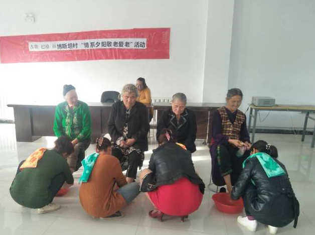 本村青年代表合唱歌曲《最美的女人是妈妈》拉开的帷幕,村民也竞相展示才艺,独舞、农民艺人的都塔尔伴唱,吉他伴唱,在场的观众观看着群众编排的节目,与大家一同吃着美味的抓饭、大盘鸡、各色糕点,新鲜的水果等食物。志愿者们认真了解并询问老人们期望开展的活动,以便后续更好地开展服务。期间还开展了给母亲洗脚、捶背等活动,表彰了本村敬老爱老模范,最后活动在欢快的共跳麦西莱普中结束。