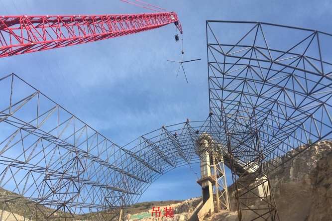 该工程长61.412米,宽32米,设计网架长方向高低差达33.855米,基础形式为四组钢筋混凝土独立基础,其中西南角基础位于原缓冲堆场骨料生产线骨料出口下部。作业施工现场处于西北山区,地势陡峭、三面环山,中间为甲方原缓冲骨料堆场生产线,前方只有一条小路可以通行。在施工过程中,要保证原缓冲堆场骨料生产不能停产,需要边施工边清理塌落的骨石料,施工场地极其受限。由于本工程的特殊性,网架安装不能以常规施工方法施工,安装难度非常大。