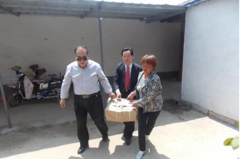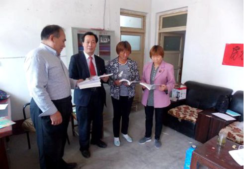 图为泰安日报社党委书记、社长,泰安传媒集团董事长戴冰同志(左一)带领韩庆全(中)走访户,调查研究,现场办公,解决难题,探索、总结脱贫攻坚战新路子。