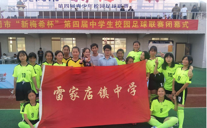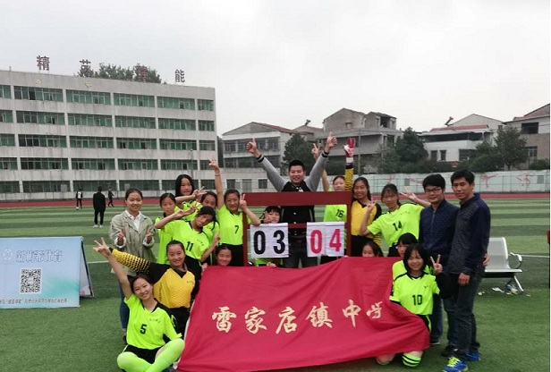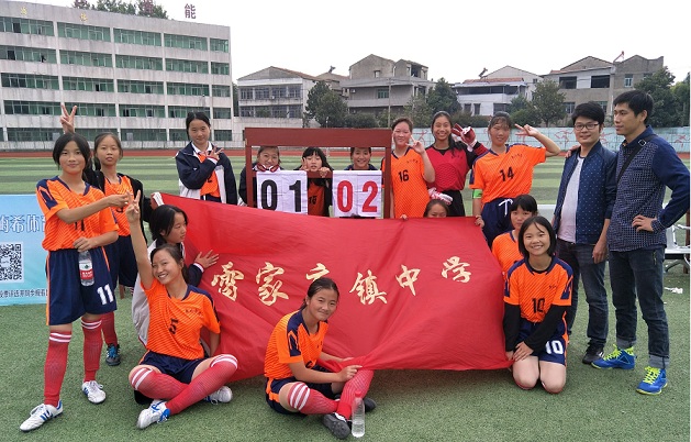 图为:雷店中学女子足球队16日下午的比赛中,以2:1赢得了比赛。