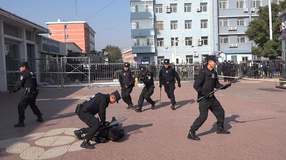 观摩组首先来到的是包头东车站广场,在这里,派出所民警们已经集结完毕,即将开展一场“持刀暴徒袭击车站”的实况演练。演练开始后,只见两名“持刀暴徒”疯狂冲入车站对工作人员和无辜旅客进行砍杀,发现警情的民警立即上报所指挥室,并带领处突小组与暴徒进行周旋,待增援赶到后,迅速对暴徒进行控制、带离,全程用时仅41秒!过程中语言规范得当、动作行云流水,起到了震慑不法分子的作用。