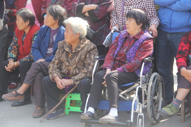 白发苍苍的老奶奶拄着拐棍、有的座着轮椅前来观看