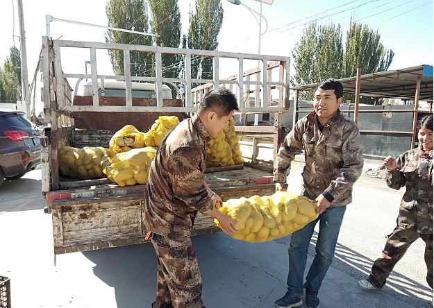拜城县人社局驻察尔齐镇孜尔克力克村“访惠聚”工作队员在入户走访中,看见村民塔依尔正在自家的菜窖里冬储洋芋,该村访惠聚工作队员带领村两委干部一起帮忙卸洋芋。村民塔依尔激动的说:“十月,我生病住院的时候,你们还专程来看我;今天,我冬储洋芋,你们又来了,你们真是我身边的活雷锋,谢谢工作队。”