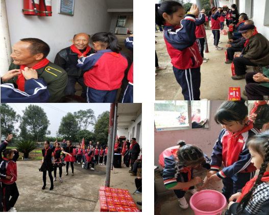 活动在杨瑞霆,李一,张雨顔的主持下,正式拉开帏幕。叶卫星校长为爷爷奶奶献上节日的问候和盛情的祝福,看,少先队代表给爷爷奶奶佩戴红领巾,爷爷奶奶笑得多开心,接着孩子们献上学校的礼品,还为老人们准备了精美的节目,节目完后孩子们扶着老人进房间并帮助老人打扫卫生。