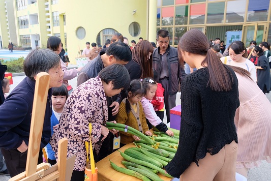 10月23日下午,余姚市低塘街道实验幼儿园举行中班段果蔬展销体验活动,每个班级的幼儿在家长、老师的协助下,将在园农场里采摘的花生、毛豆、番薯、丝瓜等果蔬进行设摊展销。