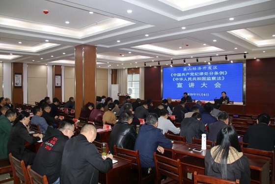 清风网湖北讯(通讯员   李海建    童曙明)11月6日,湖北英山县经济开发区管委会举行了新修订的《中国共产党纪律处分条例》和《监察法》集中学习宣讲大会,开发区机关、各派驻机构全体干部职工及规模上以上企业业主、支部书记共计100多人参加了学习。县纪委常委、监委委员雷刚同志到场做专题宣讲。