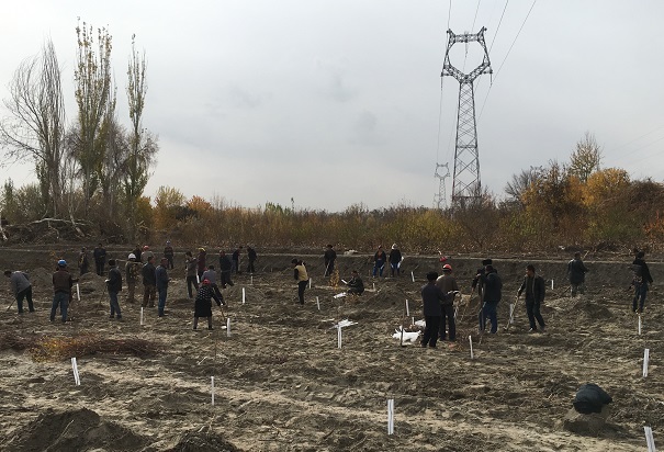在植树现场,党员群众响应号召,大家个个热情饱满,挥锹的挥锹、提水的提水,为小树浇水,松土,一片忙碌的景象,用自己的实际行动撒播了绿色,增添了和谐,成为了秋天里一道靓丽的风景线。休息时分,负责宣传的工作队队员热孜完古丽·努尔强化了此次活动的舆论宣传,大力宣传生态林栽种的重大意义,激发调动在场群众的积极性,营造植树造林工作的良好氛围。