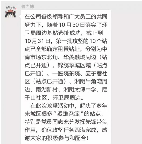 为有效增强网络运营能力,聚力提升用户感知和网络价值,岳阳市分公司在全员中发出倡议,倡导员工利用个人社会资源和人脉关系,积极参与到基站建设租赁工作中来,为公司网络服务质量提升贡献力量。10个攻坚克难站点公示后,分公司员工尤其是党员同志积极行动,主动对接相关热点区域的单位和个人,力争在热点区域寻找到合适的基站。