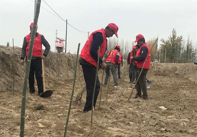 清风网讯(通讯员 阿克苏地区“访惠聚”驻村工作领导小组办公室 付强芝)为深入推动沙雅县英买力镇喀什艾日克村党员、干部切实转变绿色环保思想、严明工作纪律,使得“绿水青山就是金山银山”、“乡村振兴”新理念在我村落地开花。11月8日,英买力镇喀什艾日克村结合“聚焦总目标 作风再整顿”专项活动组织全体党员、干部39人,在新平整的50亩绿化带开展植树造林活动。