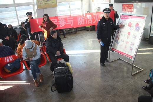 期间,民警首先在候车室,将秋冬防火、灭火常识、火场逃生自救技能向来往旅客进行广泛宣传,增强群众旅客学习消防常识以及参与消防安全培训的积极性。随后,民警又组织铁路各内部单位按照“消防应急预案”的要求,开展消防技能演习。在进行的灭火演练上,由指定人员用准备好的易燃物点燃,要求每人熟悉掌握灭火器,并要以最快的时间灭掉火源。演练初期,职工面对燃烧的大火明显感到紧张和动作生疏,随着演练的深入,大家都逐渐适应,有条不紊的投入到灭火演练中。