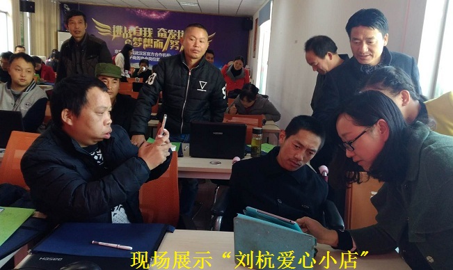 培训班上,英山县陶家河乡英太寨村“靠鼻尖打字,靠下巴移动鼠标”的重度残疾人刘杭,现场展示“刘杭爱心小店”,引来众多参训学员驻足围观。纷纷为刘杭身残志坚,自强不息的精神所感动。