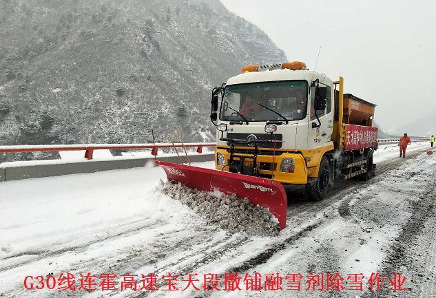 甘肃天水公路管理局高养中心以雪为令,启动防滑保畅应急预案,昼夜奋战,采取有效措施投入到除雪防滑保畅的攻坚战中。夜间在长大下坡和易结冰路段撒铺融雪剂,白天多功能除雪车全线撒铺融雪剂推雪,人工配合小型融雪剂撒布机在急弯长坡、桥面、隧道进出口等重点路段撒铺融雪剂和防滑料,全面打冰除雪。