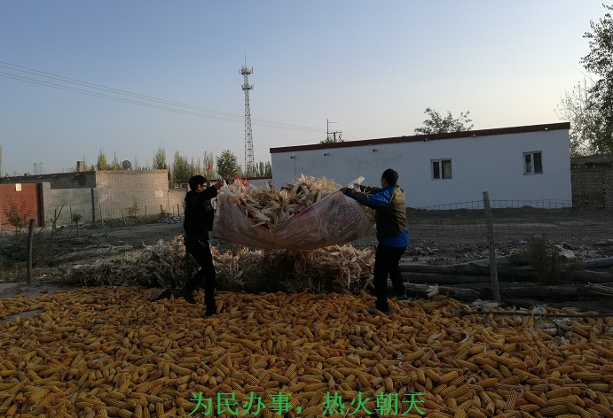 清风网讯(通讯员:拜城县税务局 吴贝尔)2018年11月18日,拜城税务局驻亚吐尔乡帕什塔其村“访惠聚”工作队队长李源洁带领全体工作队队员到贫困户合尔尼沙汗·吐尼亚孜家进行帮扶。在前期入户走访的过程中,工作队了解到该户由于家里人员生病住院,目前的主要困难就是家中收玉米缺乏劳动力。工作队员一行到该户家后,看到收割机收割以后的玉米在院子里堆积如山,家里只有她一个女人和一个孩子,若是她一个人进行摊开晾晒,至少需要两天的时间,而新收的玉米由于水分较多,堆积时间长了可能会发热发霉,影响玉米的质量,一年辛苦就要打水漂了。