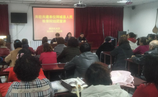 018年11月26日晚,拜城镇英巴扎社区共驻共建单位县人民检察院干部来到社区,在三楼会议室为辖区37名居民代表上了一堂预防违法犯罪的宣传教育课,社区书记、“访惠聚”工作队参加了此次宣讲。此活动为进一步增强辖区居民法律意识,人人争做懂法守法的好公民。