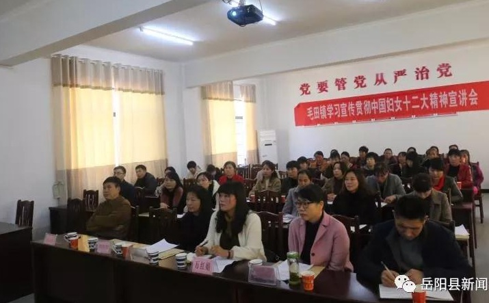 岳阳县妇联主席黄丽娟作了学习中国妇女十二大主题宣讲报告;妇联先进党组织书记黄道村总支部书记彭勇作了发言;毛田镇妇联主席佘玉霞宣读了《关于迅速在全镇掀起学习宣传贯彻中国妇女十二大精神和开展“巾帼心向党、建功新时代”主题活动的通知》;毛田镇党委书记李林书就如何贯彻学习中国妇女十二大和开展“巾帼心向党、建功新时代”系列活动作了讲话。李林在讲话中要求广大毛田妇女搞好“三学”活动,当好“四性”女人。“三学”即:妇联干部带头深入学,周密组织细致学,结合实际做中学。”当好“四性”女人,即:牢牢把握大会精髓,不断开拓理性女人的新风度;紧紧跟上时代新潮,不断彰显知性女人的新风采;好好经营温馨小家,不断塑造柔性女人的新风范;处处服务工作大局,不断担当个性女人的新风尚。