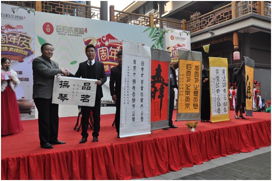 文化部高级美术师、78岁的岳阳资深书法家郑本笃现场泼墨挥毫“茗茶抚琴”作品赠送给茶博城,表达了广大市民对茶博城兴旺发达的美好祝福。