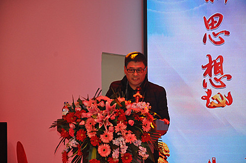 彭宇波女士(右)讲话,并捐赠蔡家藏品给辽宁森茂公司李凤海(左)