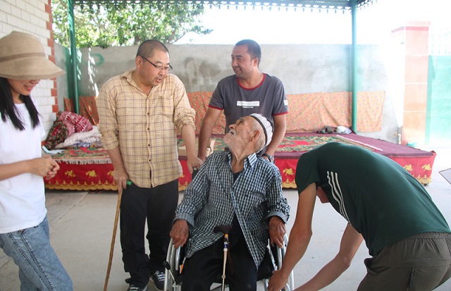 黄宫村第五村民小组有一位百岁老人,精神饱满,神志清楚,当王兵带着工作队员到老人家里时,老人很热情,也很健谈,给大家讲述了许多他的故事,工作队员们也给老人宣讲了一些党的惠民政策和法律知识。老人因年事已高,行走不便, 一根用了几十年的拐棍是老人离不开的移动工具。当王兵把老人扶上为他新购置的轮椅上时,老人感激地说:“王书记,我几十年都扶着拐,没想到今天不扶拐也能出门啦!感谢党和政府把这么好的干部送到我们身边,你们就是我最亲的人!”一台轮椅,虽然普通,但是对老人来说却无疑是雪中送炭,可以更方便的“走出”家门。