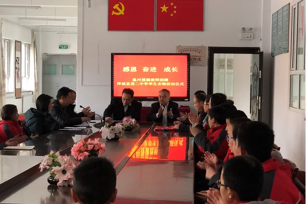 此次活动中,第二中学校长代表学校和全体师生向温州老师和浙江迷西仕服饰有限公司表示衷心的感谢,也向受捐赠学生提出了期许,希望他们努力进取以优异的成绩来报答社会的关爱之情。其次由校领导和温州老师为家庭贫困、品学兼优的学生进行赠衣仪式、受捐赠的少先队员给领导及温州教师佩戴红领巾、学生代表用朴实的语言表达了受助学生的感激之情,并表示一定会刻苦努力,脚踏实地地学好本领,用丰厚的知识和爱心回报母校,回报社会。
