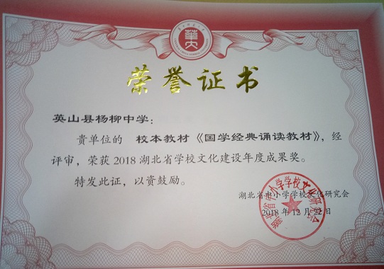 在颁奖环节,先后颁发了“2018湖北省学校文化建设百强校” 、“2018湖北省学校文化建设创新奖”、“ 2018湖北省学校建设年度成果奖”、“学校文化建设先进工作者奖”、“学校文化建设优秀论文奖”、“学校后勤文化建设奖”、第八届“枫叶国际杯”湖北省优秀作文奖和第一届“天问杯”湖北省中小学书法大赛奖等八个奖项。英山县杨柳中学、长冲高中荣获全省校园文化百强校,杨柳中学还荣获全省学校后勤文化建设先进学校,杨柳中学徐盛校长、长冲高中周皓校长荣获校园文化建设创新奖,杨柳中学校本教材《国学经典诵读教材》、长冲高中校刊《甘棠雨》荣获学校文化建设年度成果奖,杨柳中学刘卫星、长冲高中张晶荣获学校文化建设先进工作者,杨柳中学胡锦菲荣获学校后勤文化建设先进工作者,杨柳中学郑雄、柯嫦娥荣获学校文化建设优秀论文一等奖。其中,“2018湖北省学校文化建设百强校”光荣榜、“2018湖北省学校文化建设创新奖”光荣榜、“2018湖北省学校文化建设年度成果奖”光荣榜已在12月10日《中国教育报》专版刊登,引起了全国广泛关注和强烈反响。