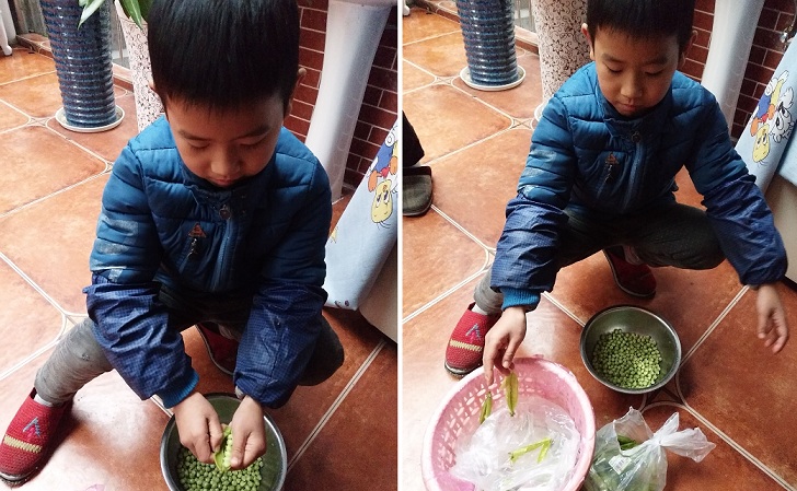 上午,奶奶买菜回来,冻得直哆嗦。我接过袋子一看,有我最喜欢吃的毛豆,我对奶奶说:“今天剥豆子的事情就包给我。”奶奶笑嘻嘻地说:“我的乖孙子长大了,也能分担爱心家务了。”