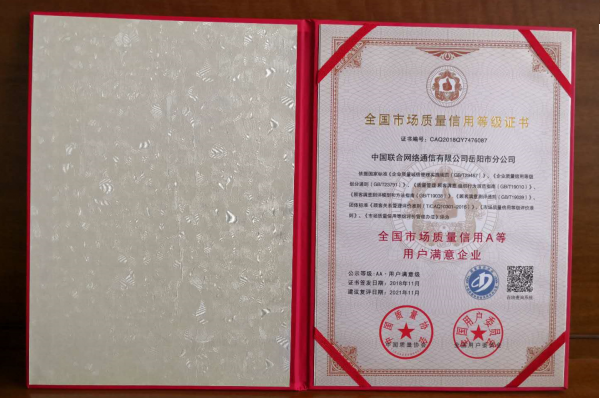 清风网岳阳讯(通讯员: 严娇)2018年12月18日,在2018年满意中国年会上,岳阳联通荣获“中国质量协会全国用户委员会”颁发的“2018年全国市场质量信用AA等级用户满意企业”奖牌和证书。